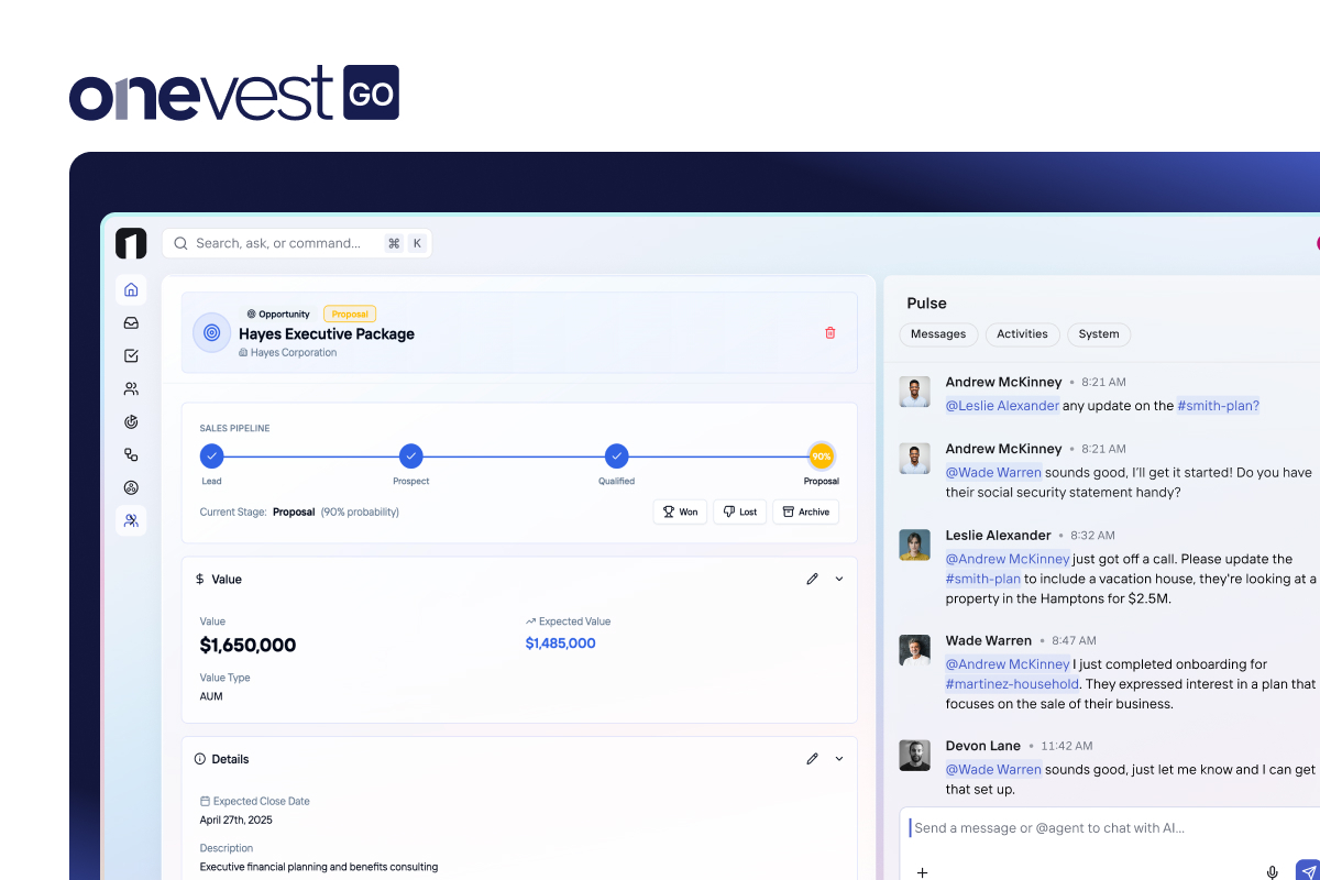 This is a workspace that is leveraging OneVest’s new Pulse feature, where messaging, meetings, and client history live in one continuous stream, allowing your team to collaborate in context instead of jumping between fragmented tools. OneVest GO unifies the disparate tools advisors use every day into one high-velocity workspace: