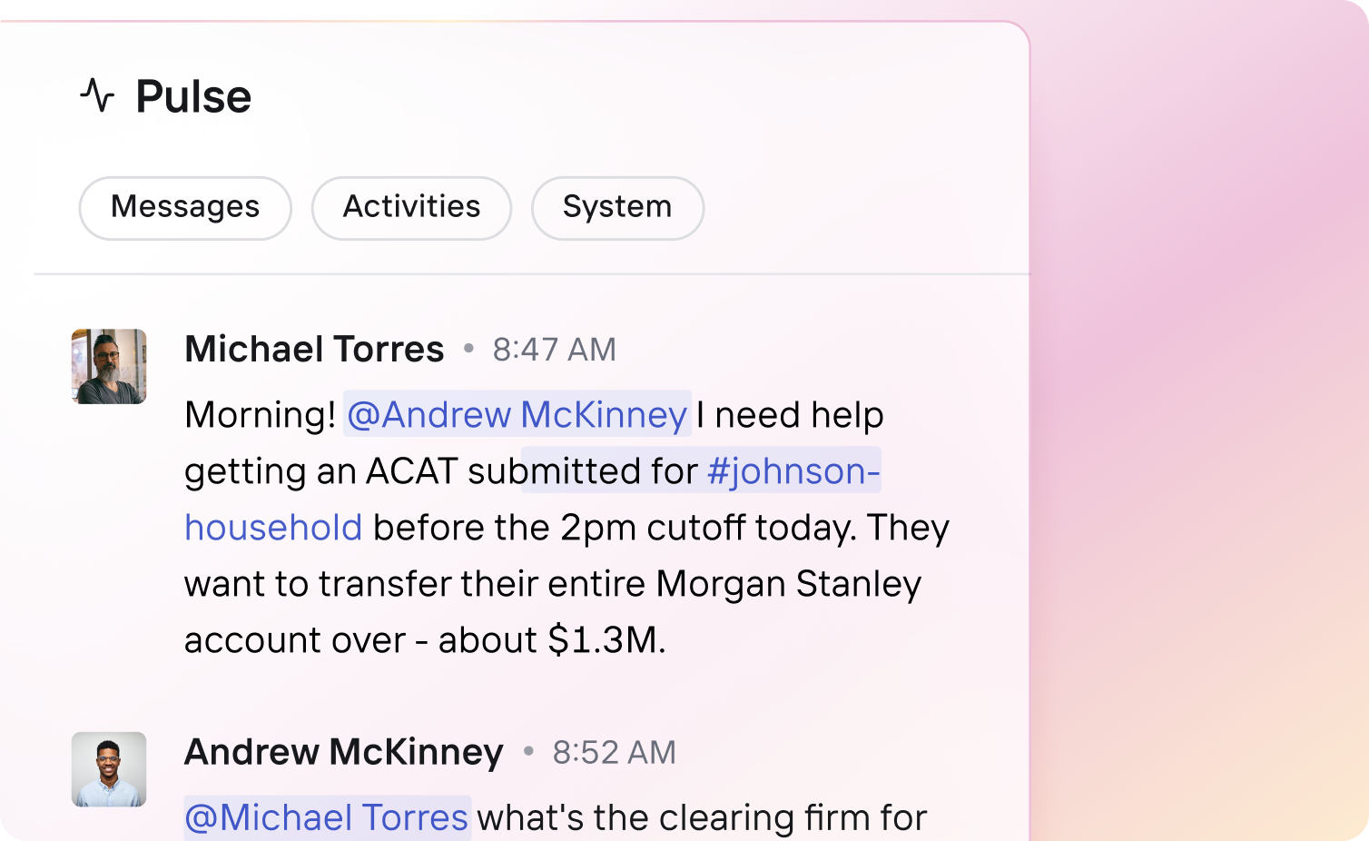 Messaging, tasks, approvals, and execution live in one shared activity layer where advisors, operations, home office teams, and the agent work in context. Every action is visible, tied to the client record, and moves work forward together.