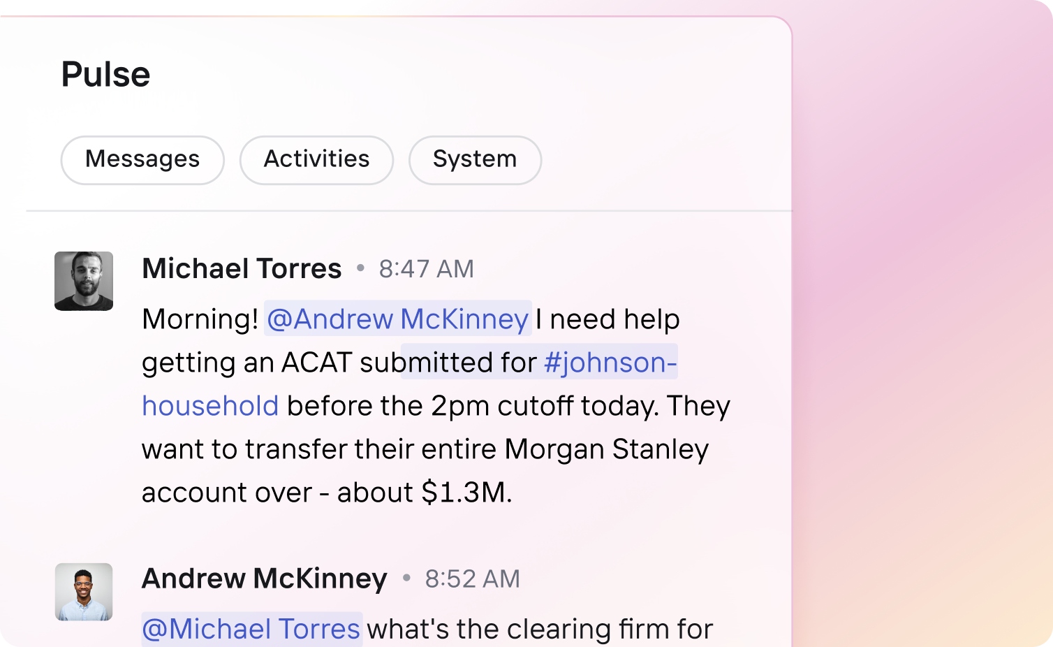 Messaging, tasks, approvals, and execution live in one shared activity layer where advisors, operations, home office teams, and the agent work in context. Every action is visible, tied to the client record, and moves work forward together.